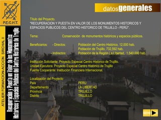 El documento describe un proyecto para recuperar y poner en valor los monumentos históricos y espacios públicos del centro histórico de Trujillo, Perú. El proyecto consiste en la conservación de monumentos en riesgo, la recuperación de espacios públicos, capacitación de recursos humanos, y la creación de un fondo rotatorio para la restauración de monumentos históricos privados. Se espera que el proyecto mejore la calidad de vida de los residentes y aumente el valor de la propiedad mediante la restauración de
