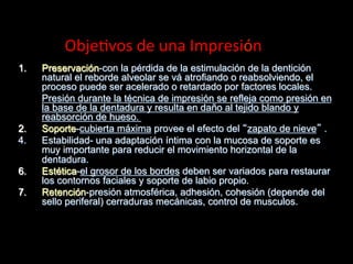 Este documento proporciona información sobre técnicas de impresión final, incluyendo objetivos de impresiones, captura de bordes fisiológicos, selección de materiales de impresión y más. El documento enfatiza la importancia de registrar los tejidos blandos en una posición de descanso para evitar daño y reabsorción.