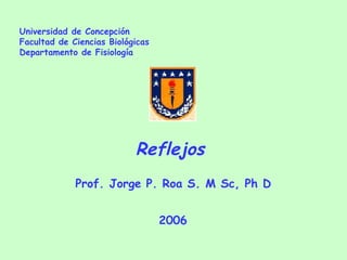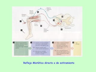 El documento describe diferentes tipos de reflejos, incluyendo el reflejo miotático directo, el reflejo miotático inverso, el reflejo flexor y el reflejo extensor cruzado. También menciona el reflejo barorreceptor y su papel en la regulación de la presión arterial, así como el mecanismo de transducción en los mecanorreceptores.