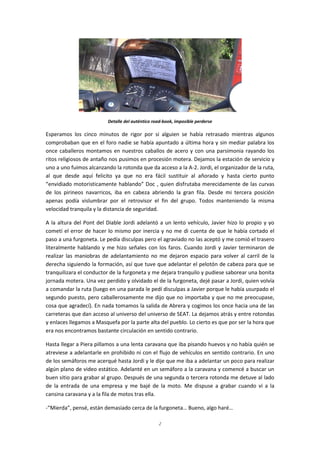 El documento describe una salida motera primaveral de un grupo de 11 motociclistas. Se reunieron en una gasolinera y recorrieron varias carreteras catalanas haciendo paradas para comer y beber cerveza. A lo largo del día se dividieron en grupos más pequeños y tuvieron algunos percances menores con otros vehículos. Al final del día se despidieron en otra gasolinera después de haber disfrutado del paisaje y la compañía durante la excursión.