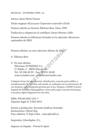 Este documento presenta una introducción a la expresión corporal como actividad pedagógica para niños de 3 a 10 años. Explica que la expresión corporal permite comunicar ideas a través del movimiento del cuerpo de manera auténtica. A continuación, propone 40 juegos de expresión corporal organizados en cuatro categorías temáticas y ofrece consejos sobre cómo variar los juegos y la conducta pedagógica del maestro.
