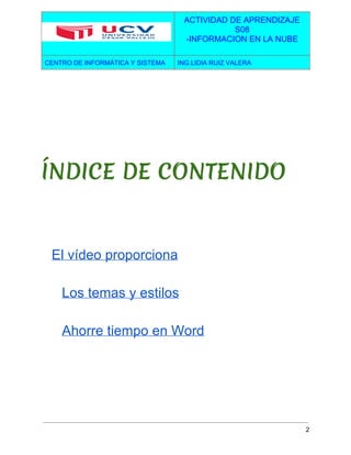 El documento describe las funciones de Microsoft Word para mejorar la presentación y lectura de documentos. Word ofrece temas, estilos y diseños que mantienen la coherencia visual. También proporciona botones e inserciones de video para facilitar la creación de documentos profesionales de manera eficiente.