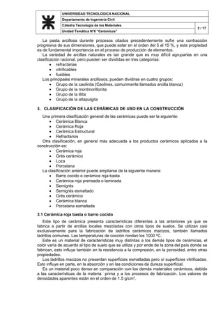 Este documento trata sobre los materiales cerámicos y su clasificación para su uso en la construcción. Explica que las materias primas son las arcillas y describe los procesos de fabricación de diferentes tipos de cerámicas como la roja, blanca y porcelana. Además, clasifica los cerámicos en barro cocido, prensado, semigrés, grés y refractarios; e indica los productos comerciales de cada uno.