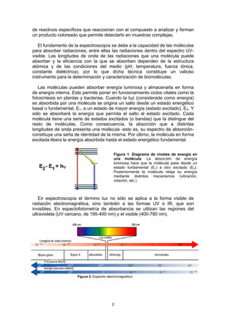 Este documento describe la técnica de espectrofotometría UV-visible y su aplicación para cuantificar biomoléculas. La espectrofotometría se basa en que las moléculas absorben luz de manera dependiente de su concentración. Se utiliza un espectrofotómetro para medir la luz absorbida por una muestra a diferentes longitudes de onda. La ley de Beer-Lambert establece la relación entre la absorbancia, concentración y distancia recorrida por la luz. Mediante espectros de absorción y cur