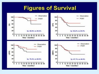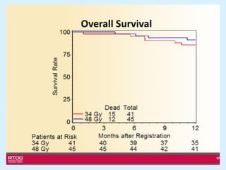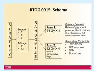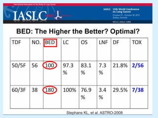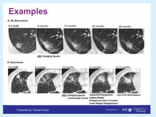 El documento detalla los avances en radioterapia para el tratamiento del cáncer de pulmón, enfocándose en la efectividad de la radioterapia estereotáctica corporal (SBRT) y su dosificación óptima en pacientes no operables. Se presentan estudios que demuestran que una dosis media de 100-112.3 Gy ofrece mejores resultados en supervivencia, mientras que se identifican signos en tomografías que pueden predecir recaídas locales. Además, se discuten aspectos de toxicidad y la importancia de la protección del hipocampo durante la radioterapia craneal para preservar la memoria.