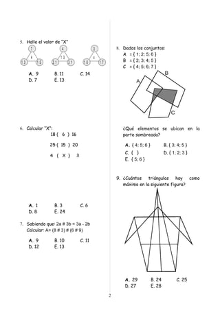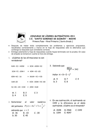 Este documento presenta un concurso de matemáticas para estudiantes de sexto grado con 14 problemas matemáticos. Los estudiantes deben resolver los problemas correctamente y marcar sus respuestas en una hoja. En caso de empate, se tomará en cuenta la hora de entrega.