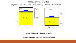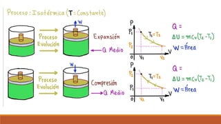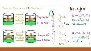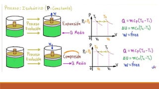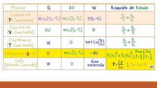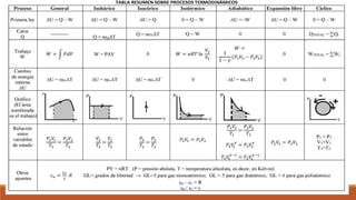 El documento resume los principales procesos termodinámicos: procesos isotérmicos, adiabáticos, isocóricos e isobáricos. Estos procesos involucran cambios en la energía interna, calor y trabajo de un sistema. También define procesos cuasi-estáticos, de flujo estacionario y presenta una tabla resumen de las características de cada proceso termodinámico.