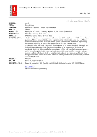 La exposición 'Alfonso. Cuidado con la Memoria' se exhibirá en Madrid del 5 de noviembre de 2021 al 23 de enero de 2022 en la Sala Canal de Isabel II para conmemorar la firma fotográfica Alfonso y su papel en la documentación de la Guerra Civil española. El programa 'Ensamblajes: Contextos para una Ecología de Saberes' abordará nuevas perspectivas sobre la ciencia a través de conversatorios y un taller del 10 al 13 de noviembre. Se ofrecen 6 becas de formación prá