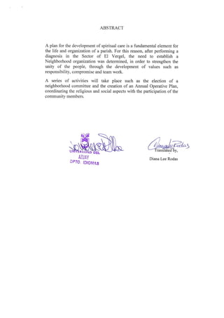 El documento presenta un plan de desarrollo pastoral-social para la parroquia El Vergel, destacando la necesidad de establecer una organización barrial que promueva la unidad y los valores comunitarios. Se enfocan en la participación activa de los habitantes en actividades como la elección de un comité barrial y la elaboración de un plan operativo anual, integrando aspectos religiosos y sociales. Se enfatiza la importancia del liderazgo y la organización para lograr objetivos comunitarios a través de un diagnóstico participativo.