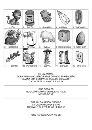 Este documento contiene 15 adivinanzas sobre objetos y animales comunes como el león, el buzón, los guantes, el biberón, los cordones de los zapatos, el bombero, la nevera, la oveja, el despertador, la almendra, la espina de pescado, el periódico, la lluvia, el espejo y el enchufe. También incluye una adivinanza sobre cómo caminan los humanos a diferentes edades y otra sobre un animal misterioso.