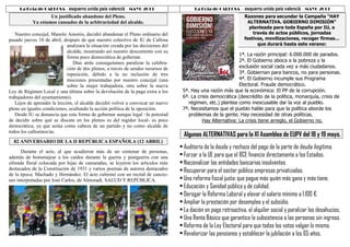 Este documento resume varias noticias y eventos de la ciudad de Callosa, incluyendo la aprobación de bolsas de trabajo sin suficiente publicidad por parte del gobierno local del PP, la celebración del aniversario de la II República Española, y las razones para apoyar la campaña de Izquierda Unida para pedir la dimisión del gobierno actual debido al alto desempleo y la austeridad.