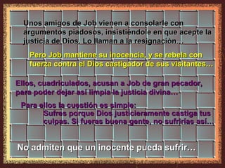Este documento resume las intervenciones de los amigos de Job, Elifaz, Bildad y Sofar, defendiendo la idea de un Dios estrictamente justiciero que castiga siempre el mal y recompensa siempre el bien. Argumentan que los sufrimientos de Job son un castigo divino por sus pecados, aunque Job mantiene su inocencia. Más tarde interviene Elihú con argumentos similares, aunque reconoce que a veces Dios usa el sufrimiento para enseñar.