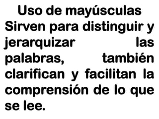 El documento explica los usos de las mayúsculas para distinguir y jerarquizar palabras y facilitar la comprensión al leer. También describe la diferencia entre sílabas tónicas y átonas al pronunciar palabras de más de una sílaba, y clasifica las palabras en agudas, graves y esdrújulas dependiendo de la ubicación de la sílaba tónica.