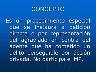 Este documento describe el proceso especial por acción penal privada en el que el ofendido (querellante) inicia directamente el proceso penal contra el acusado sin participación del Ministerio Público. El querellante presenta una querella ante un juez penal unipersonal competente y luego participa en todas las diligencias del proceso con las mismas facultades que el Ministerio Público, pudiendo ofrecer pruebas, interponer recursos y desistirse expresamente de la querella. Si la querella cumple los requisitos, el juez cita a juicio oral