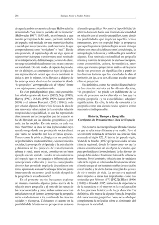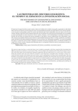 El documento aborda la evolución del discurso geográfico, destacando la importancia de la relación entre tiempo y espacio en la investigación social. Se argumenta que la geografía ha evolucionado de una visión estrictamente física y natural hacia una comprensión más humanista y social, incorporando perspectivas de diversas disciplinas. La necesidad de una hermenéutica geográfica que contemple los contextos socioculturales resalta la interconexión entre la geografía y otros campos de las ciencias sociales.