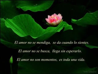 El documento ofrece consejos sobre el amor, indicando que el amor no se busca ni se fuerza, sino que llega espontáneamente. Señala que el amor no son solo momentos placenteros, sino que implica sentimientos profundos y compromiso a lo largo de la vida, incluyendo dolor y sufrimiento. Además, explica que el amor no es egoísta, sino que se trata de desear la felicidad del otro por encima de la propia y aceptar sus diferencias.