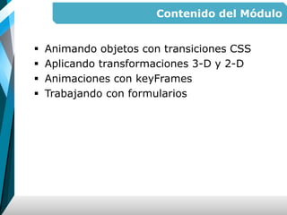 El documento ofrece una guía sobre la creación de interfaces de usuario animadas y adaptables utilizando CSS3, incluyendo transiciones, transformaciones en 2D y 3D, y animaciones con keyframes. También aborda el uso de media queries para ajustar el diseño en diferentes dispositivos y proporciona información sobre el manejo de formularios en HTML, incluyendo atributos como autocomplete, novalidate y validaciones personalizadas. Además, se mencionan ejemplos prácticos y propiedades específicas para implementar estas características.