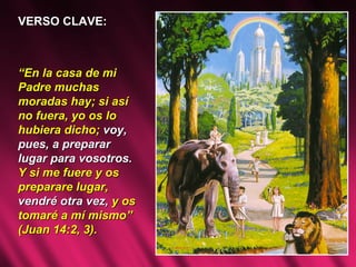 El documento describe varios aspectos de la vida en el cielo según lo enseñado en la Biblia y los escritos de Elena G. de White. Algunos de los puntos cubiertos incluyen que los creyentes resucitarán y ascenderán al cielo con Jesús, mientras que los no creyentes serán destruidos; la vida en el cielo superará nuestras mayores expectativas y conservaremos nuestra identidad individual; y no habrá pecado, sufrimiento o muerte en la nueva tierra.