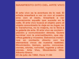 El documento presenta una línea de tiempo del desarrollo de los movimientos artísticos desde el Renacimiento hasta el siglo XXI. Algunos de los movimientos más importantes son el Renacimiento, el Barroco, el Romanticismo, el Impresionismo, el Expresionismo, el Cubismo, el Surrealismo, el Pop Art, el Minimalismo, el Land Art y el Arte Conceptual. Artistas clave como Duchamp, Malevich, Warhol y Smithson cuestionaron los límites tradicionales del arte y llevaron a nuevas formas de