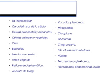 El documento proporciona información sobre las características y componentes de las células. Explica la teoría celular y describe las diferencias entre células procariotas y eucariotas. Además, detalla los principales orgánulos celulares como la membrana, el retículo endoplasmático, el aparato de Golgi, las mitocondrias y sus funciones.