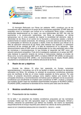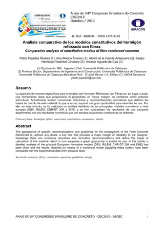 Este documento resume y compara los principales modelos constitutivos normativos para hormigón reforzado con fibras en Europa. Analiza las ecuaciones propuestas por las normas alemana DBV, italiana CNR-DT204, recomendaciones RILEM, Modelo Code y norma española EHE. Compara los resultados experimentales con los obtenidos numéricamente usando dichos modelos, evaluando su idoneidad para diferentes casos de estudio.