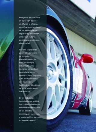 El documento describe los sistemas de control de la presión de los neumáticos y presenta evidencia científica de su eficacia. Explica los dos tipos principales de sistemas - detección indirecta y detección directa - y sus ventajas y desventajas. También analiza estudios que muestran que estos sistemas podrían reducir accidentes y víctimas al circular con mayor seguridad y presiones adecuadas. Finalmente, evalúa los costes y beneficios potenciales de su implantación universal.