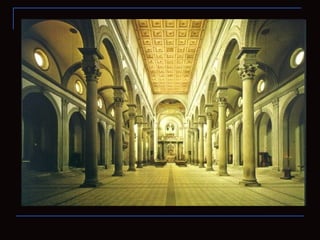 Este documento resume las características principales del Renacimiento en Italia. Se inició en Florencia en el siglo XV, donde artistas como Brunelleschi, Donatello y Masaccio descubrieron las leyes de la perspectiva y la proporción clásicas. La arquitectura adoptó formas clásicas como órdenes y simetría. La escultura se volvió más naturalista y retrató el cuerpo humano. La pintura también se volvió más realista, usando la perspectiva para dar profundidad. El mecenaz