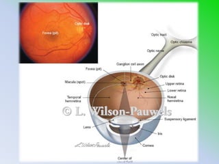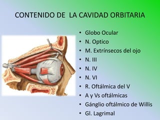 Este documento describe la anatomía de varias estructuras del rostro y cráneo. Detalla las partes del globo ocular, los músculos extrínsecos del ojo, la cavidad orbital y sus contenidos. También describe la anatomía del oído externo, medio e interno, así como las vías auditivas, vestibular y coclear. Por último, resume brevemente la vía olfatoria y gustativa.