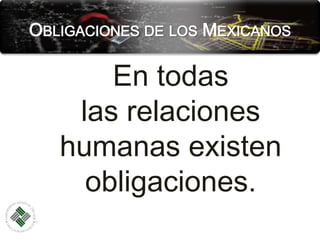 Los mexicanos tienen varias obligaciones con el Estado, incluyendo dar instrucción a los menores, realizar el servicio militar cuando sea necesario, pagar impuestos, y participar en la defensa de la patria. Todos los varones de 18 años deben registrarse para recibir instrucción militar y prestar servicio un día a la semana, mientras que las mujeres pueden hacerlo de manera voluntaria. Los impuestos son obligatorios y ayudan a cubrir los gastos públicos según el Código Fiscal de la Federación.