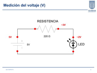 Este documento describe mediciones de voltaje y corriente en un circuito con un LED y una resistencia de 220 ohmios. Se midió un voltaje de aproximadamente 3 voltios en el LED y 2 voltios en la resistencia cuando se aplicaron 5 voltios al circuito, resultando en una corriente de alrededor de 15 miliamperes que fluyó a través del LED y la resistencia.
