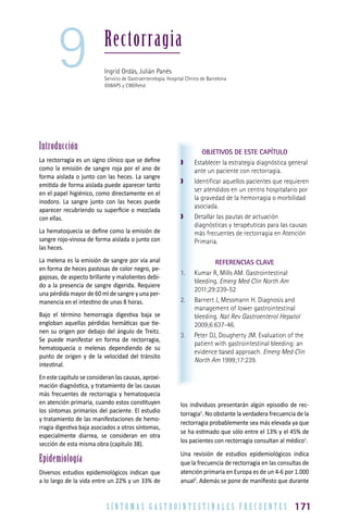Este documento describe la estrategia diagnóstica y las causas más frecuentes de rectorragia en atención primaria. Las causas más comunes son las hemorroides, la fisura anal y la ausencia de causa aparente. Se proporcionan detalles sobre el diagnóstico y tratamiento de las hemorroides y la fisura anal, que son las causas más prevalentes que pueden resolverse en atención primaria sin derivación hospitalaria. El documento también discute otras causas menos frecuentes como la diverticulosis, los pólip