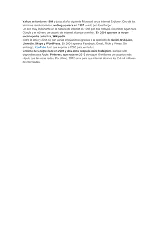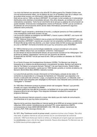 La red ARPANET se creó en 1969 por el Departamento de Defensa de EE.UU. para compartir recursos entre universidades, y contaba inicialmente con 4 ordenadores. En 1985 se popularizó el término "ciberespacio" y se desarrolló el protocolo TCP/IP. En 1990, Tim Berners-Lee y Robert Caillau desarrollaron la World Wide Web en el CERN, permitiendo la vinculación de documentos a través de hipervínculos.