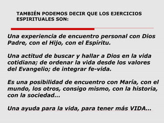 Este documento describe los Ejercicios Espirituales de San Ignacio de Loyola. Explica que los Ejercicios Espirituales consisten en exámenes de conciencia, meditación y contemplación espirituales. El documento luego describe las etapas de los Ejercicios Espirituales, incluidas la Primera, Segunda, Tercera y Cuarta Semanas, así como la Contemplación para Alcanzar Amor. Finalmente, proporciona una propuesta para realizar los Ejercicios Espirituales a lo largo de varios