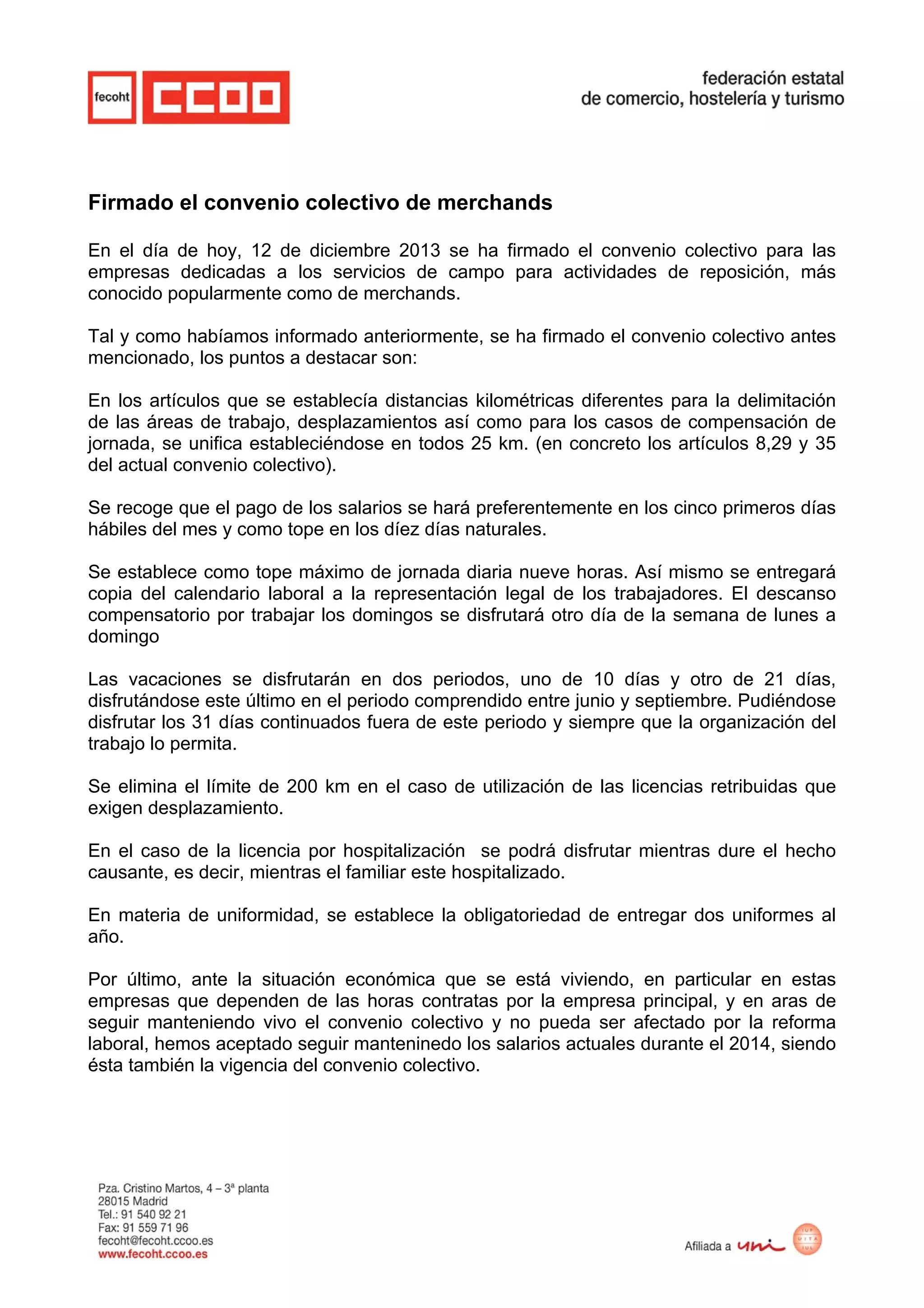 El documento resume los puntos clave del convenio colectivo recientemente firmado para las empresas de merchands. Se unifican las distancias kilométricas para delimitar áreas de trabajo y desplazamientos en 25 km. Los salarios se pagarán en los primeros 5 días hábiles del mes como máximo. La jornada máxima diaria es de 9 horas y se entregará el calendario laboral a los representantes de los trabajadores. Las vacaciones se dividirán en dos periodos de 10 y 21 días respectivamente.