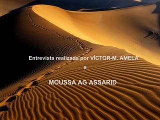 Este documento presenta una entrevista con Moussa Ag Assarid, un tuareg de Mali que creció como pastor nómada en el desierto del Sahara. Moussa describe su infancia feliz criando cabras y camellos, pero también habla sobre las dificultades que enfrentó como la muerte de su madre durante una sequía. Ahora estudia en la universidad en Francia, pero extraña profundamente su vida simple en el desierto entre su gente.
