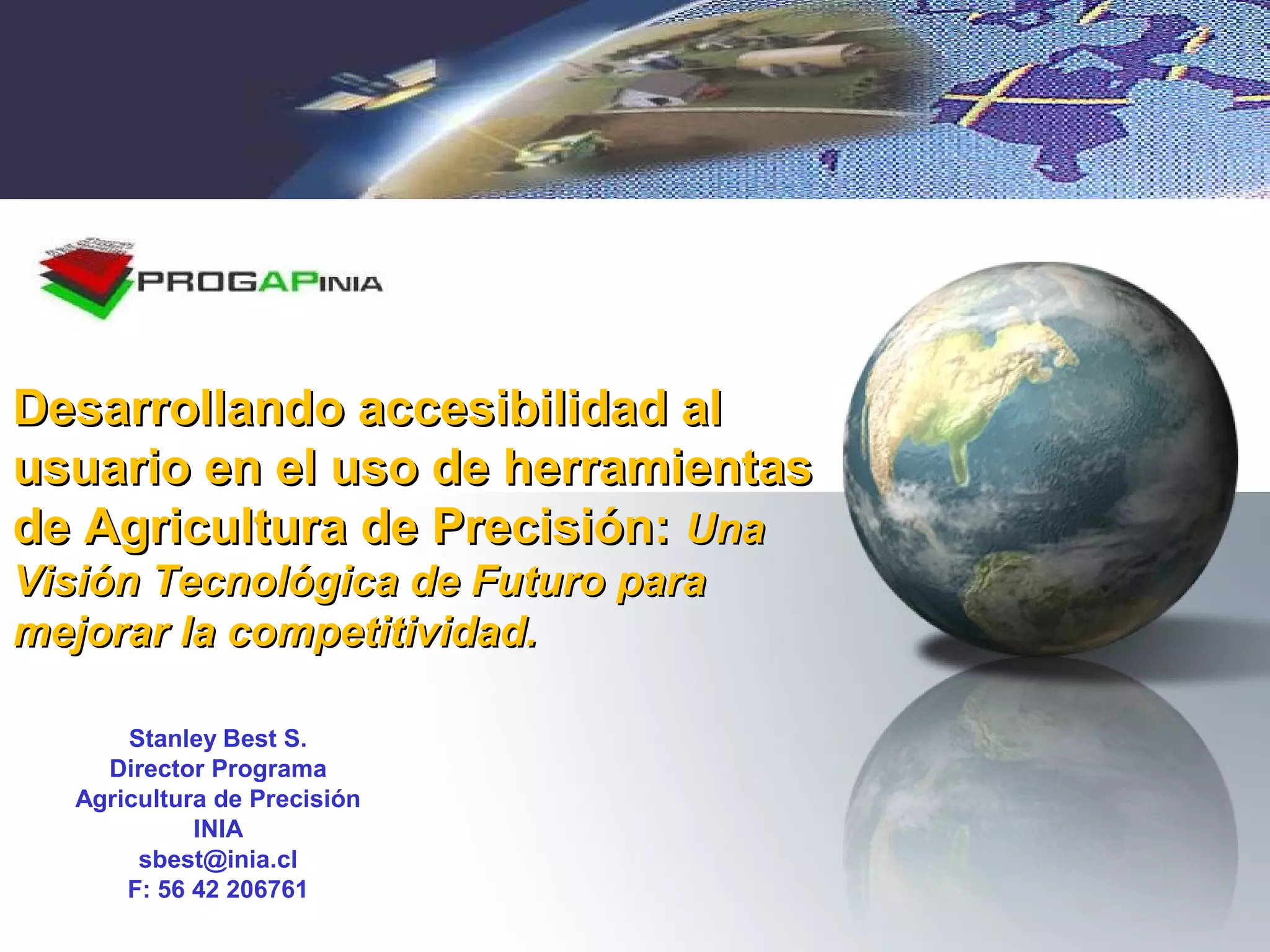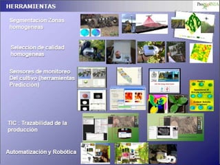 El documento discute la evolución y el futuro de la agricultura de precisión, enfocándose en la accesibilidad de herramientas tecnológicas para mejorar la competitividad en el sector agrícola. Se destaca la importancia de gestionar eficientemente la información generada en distintas escalas, así como el potencial de automación y el uso de smartphones para optimizar la producción. Además, se aborda la necesidad de resolver problemas como la falta de mano de obra calificada y la inocuidad Alimentaria para lograr prácticas agrícolas más eficientes.