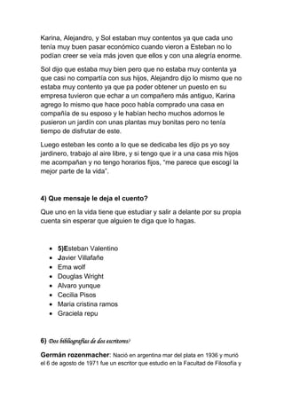 El documento presenta varias actividades relacionadas con el aprendizaje de vocabulario y gramática en español. En primer lugar, pide identificar palabras desconocidas en un cuento. Luego, solicita organizar palabras en columnas según su acentuación. Por último, propone resumir las ideas principales del cuento y responder preguntas sobre gramática, ortografía y bibliografías de escritores.
