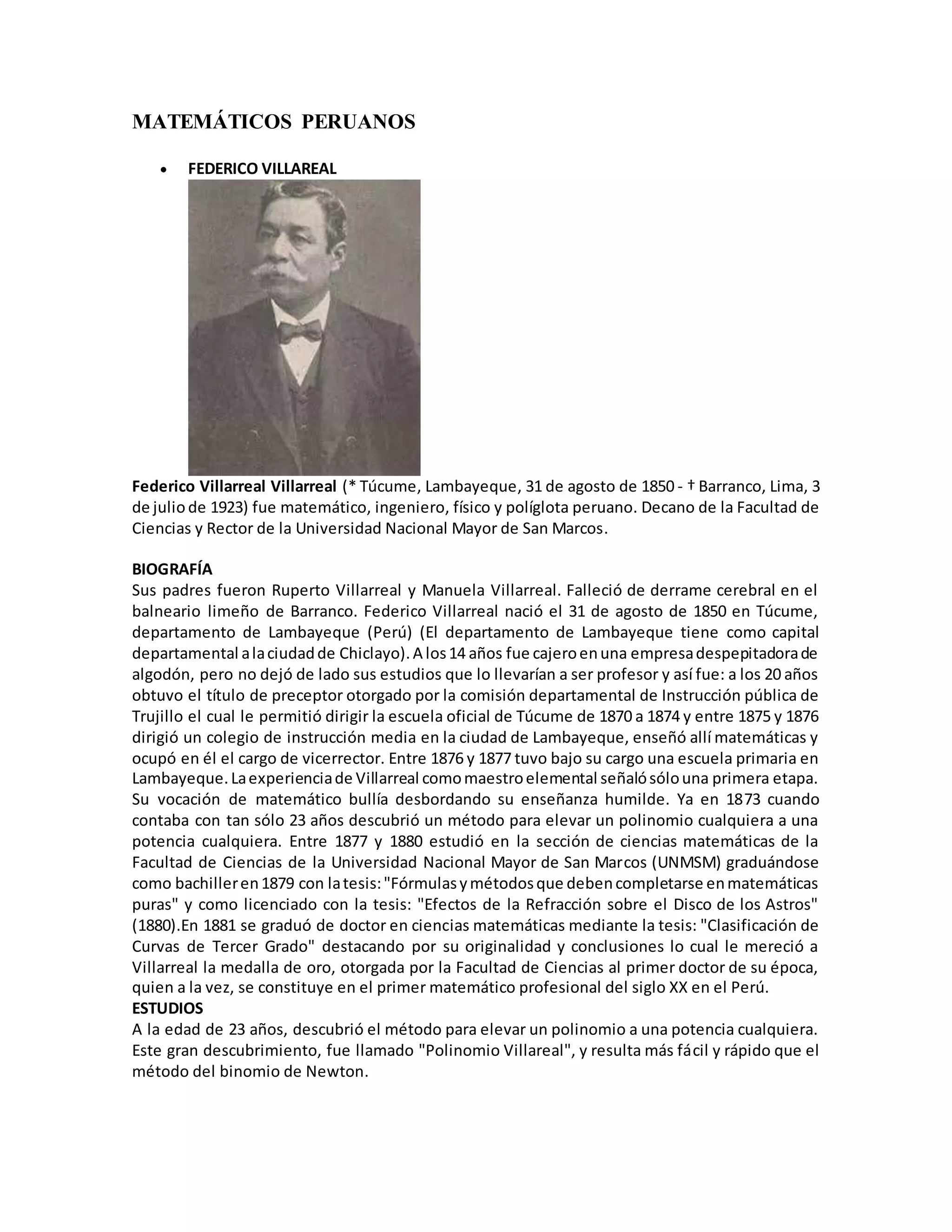 Federico Villarreal fue un destacado matemático, ingeniero, físico y políglota peruano que realizó importantes contribuciones a las matemáticas, la ingeniería y otras ciencias. A los 23 años descubrió el método para elevar polinomios a cualquier potencia. Fue decano de la Facultad de Ciencias de la Universidad Nacional Mayor de San Marcos y rector de la misma universidad. Publicó cerca de 600 artículos científicos y fue un importante divulgador de la ciencia en el Perú.