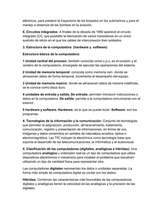 La computación se refiere al procesamiento y movilidad de la información a través de herramientas como las computadoras. Los primeros dispositivos de cómputo incluyen el ábaco y la máquina de Pascal. La computadora moderna se desarrolló a partir de las máquinas de Babbage en el siglo XIX e incluye hardware como la CPU, memoria y unidades de entrada/salida, así como software. Las tecnologías de la información y comunicación ahora permiten el almacenamiento y transmisión de datos, voz e imágenes.