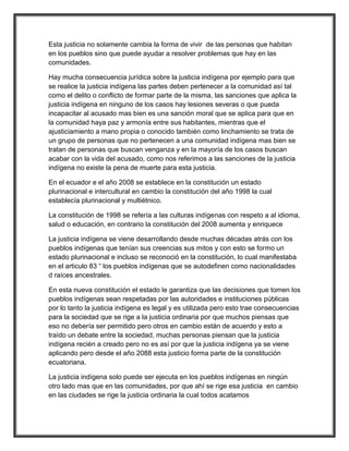 El documento discute las consecuencias jurídicas de la justicia indígena en Ecuador. Explica que la justicia indígena ha existido desde antes de la colonización y se rige por el derecho consuetudinario. Aunque la constitución ecuatoriana reconoce la justicia indígena, existe controversia sobre si respeta los derechos humanos. Algunos argumentan que castigos como latigazos y ortigazos son tortura, mientras que los pueblos indígenas dicen que es una forma de purificación y rehabilitación