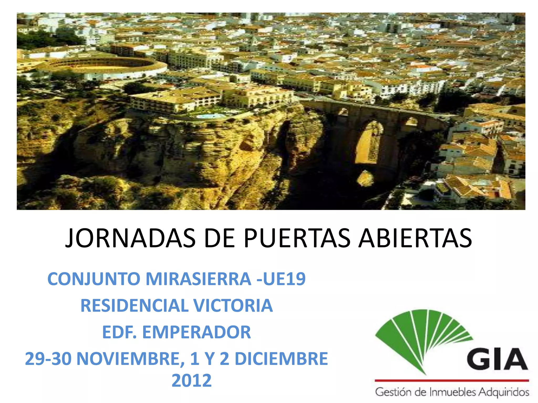 Este documento anuncia jornadas de puertas abiertas del 29 de noviembre al 2 de diciembre de 2012 en tres proyectos inmobiliarios en Ronda: Conjunto Mirasierra, Residencial Victoria y Edificio Emperador. Se proporcionan detalles sobre las características, precios rebajados y contactos de cada proyecto.
