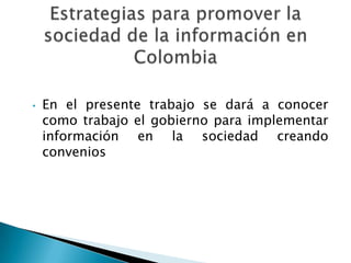 Este documento describe cómo el gobierno de Sudamérica creó la Agenda de Conectividad en el 2000 para implementar tecnologías de información en la sociedad a través de convenios. La Agenda tiene como objetivos integrar esfuerzos existentes, aprovechar experiencias nacionales e internacionales, crear alianzas, dar acceso a infraestructura de información y promover el uso de TI en empresas y el gobierno en línea. La Agenda ha tenido éxito coordinando esfuerzos y proyectos como la contratación pública electrónica.