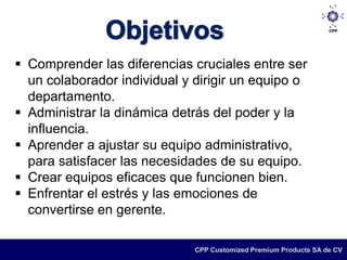 El documento aborda la transición de un colaborador individual a un gerente, enfatizando la necesidad de habilidades diferentes en el liderazgo, la administración de equipos y la gestión de relaciones. Se destacan realidades como la disminución de la libertad, la importancia del poder y la influencia, y el valor de la capacitación combinada con la experiencia práctica. Además, se discute la gestión de equipos, la retroalimentación, la construcción de agendas y redes, así como la importancia de la inteligencia emocional en el liderazgo.