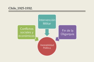 Este documento resume el periodo de inestabilidad política en Chile entre 1925 y 1932. Tras la Constitución de 1925 hubo elecciones presidenciales donde resultó electo Emiliano Figueroa. En 1927 fue electo Carlos Ibáñez del Campo, quien gobernó de forma autoritaria hasta 1931 imponiendo censura y represión. La crisis económica mundial de 1929 afectó a Chile y llevó a la renuncia de Ibáñez en 1931, dando paso a un periodo de inestabilidad política con varios gobiernos hasta la