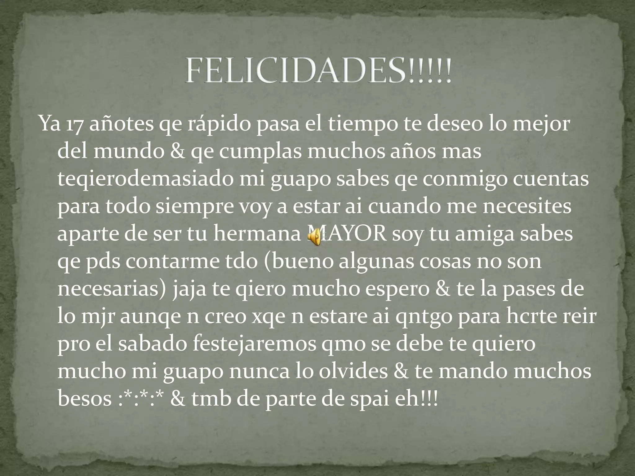 Este documento es una carta de cumpleaños de una hermana mayor a su hermano menor. En ella, la hermana le desea lo mejor a su hermano en su cumpleaños número 17 y le expresa su amor incondicional. También comparte recuerdos felices de su infancia juntos y le asegura que siempre podrá contar con ella. Por último, le desea que cumpla muchos más años y que logre todos sus sueños.