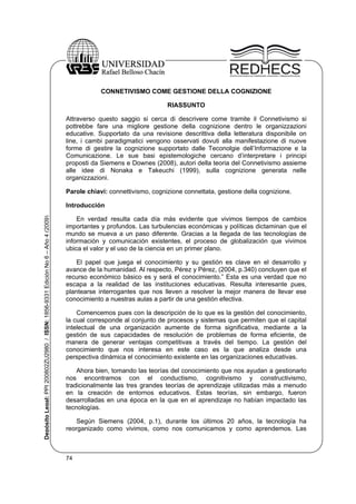 Este documento describe el conectivismo como una teoría del aprendizaje para la era digital que puede dar una mejor gestión del conocimiento en organizaciones educativas. Explica que el conectivismo se basa en las limitaciones de teorías previas del aprendizaje y en cómo la tecnología ha cambiado la forma en que aprendemos. También resume algunos principios clave del conectivismo como la importancia del aprendizaje informal a través de redes y comunidades y cómo el conocimiento se vuelve obsoleto más rápido.