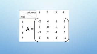 El documento aborda la definición y clasificación de matrices, presentando varios tipos, incluyendo matrices cuadradas, diagonales, identidad y simétricas, entre otras. También se explican las operaciones básicas con matrices, como la adición, resta y multiplicación, así como conceptos como matriz traspuesta y opuesta. Finalmente, se incluyen referencias para el estudio de álgebra lineal.