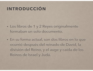Los libros de 1 y 2 Reyes narran la historia de los reinos de Israel y Judá después del reinado de David. Se destaca el reinado de Salomón y la división posterior en dos reinos. Ambos reinos oscilan entre la fidelidad y la infidelidad a Dios a través de sus reyes, lo que lleva eventualmente a su caída; Israel cae ante los asirios y Judá ante los babilonios. Figuras como Elías y Eliseo juegan un papel importante como profetas que advierten a los reyes.