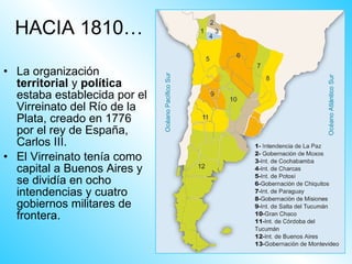 El documento describe la sociedad y la organización política y territorial de la Argentina colonial bajo el Virreinato del Río de la Plata. La sociedad estaba dividida en grupos de blancos (españoles y criollos), nativos, negros y mestizos. Vivían principalmente en ciudades como Buenos Aires, divididas en barrios alrededor de la plaza central. Se comunicaban a través de cartas llevadas por mensajeros a caballo y se transportaban en barcos, carretas y diligencias tiradas por animales. Pasaban el tiempo bailando, tomando mate