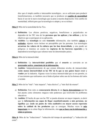 Este documento resume 15 mitos comunes sobre la sociedad de la información y la educación. Cada mito se define brevemente y luego se analiza, señalando por qué puede ser engañoso o incompleto. Los mitos incluyen que la tecnología reducirá el tiempo y el costo de aprendizaje, que fomentará la participación igualitaria, y que reemplazará a los profesores. El documento concluye que la tecnología no es una panacea y que sus efectos dependen de cómo se utiliza en el contexto educativo.